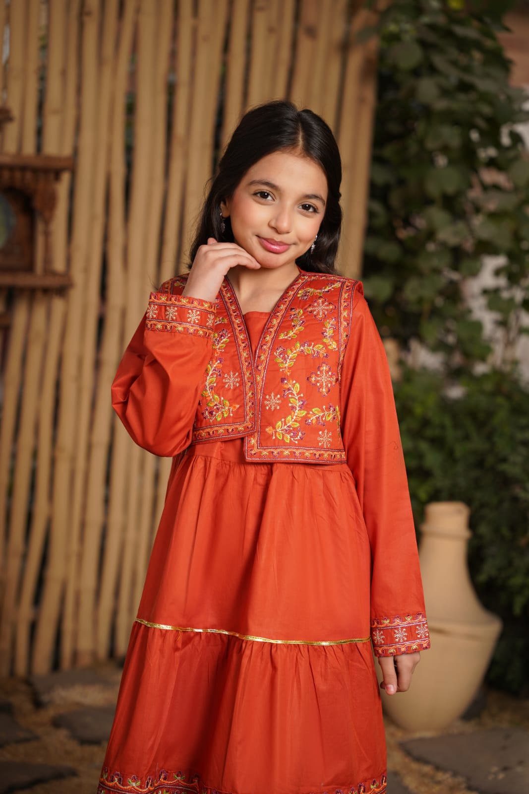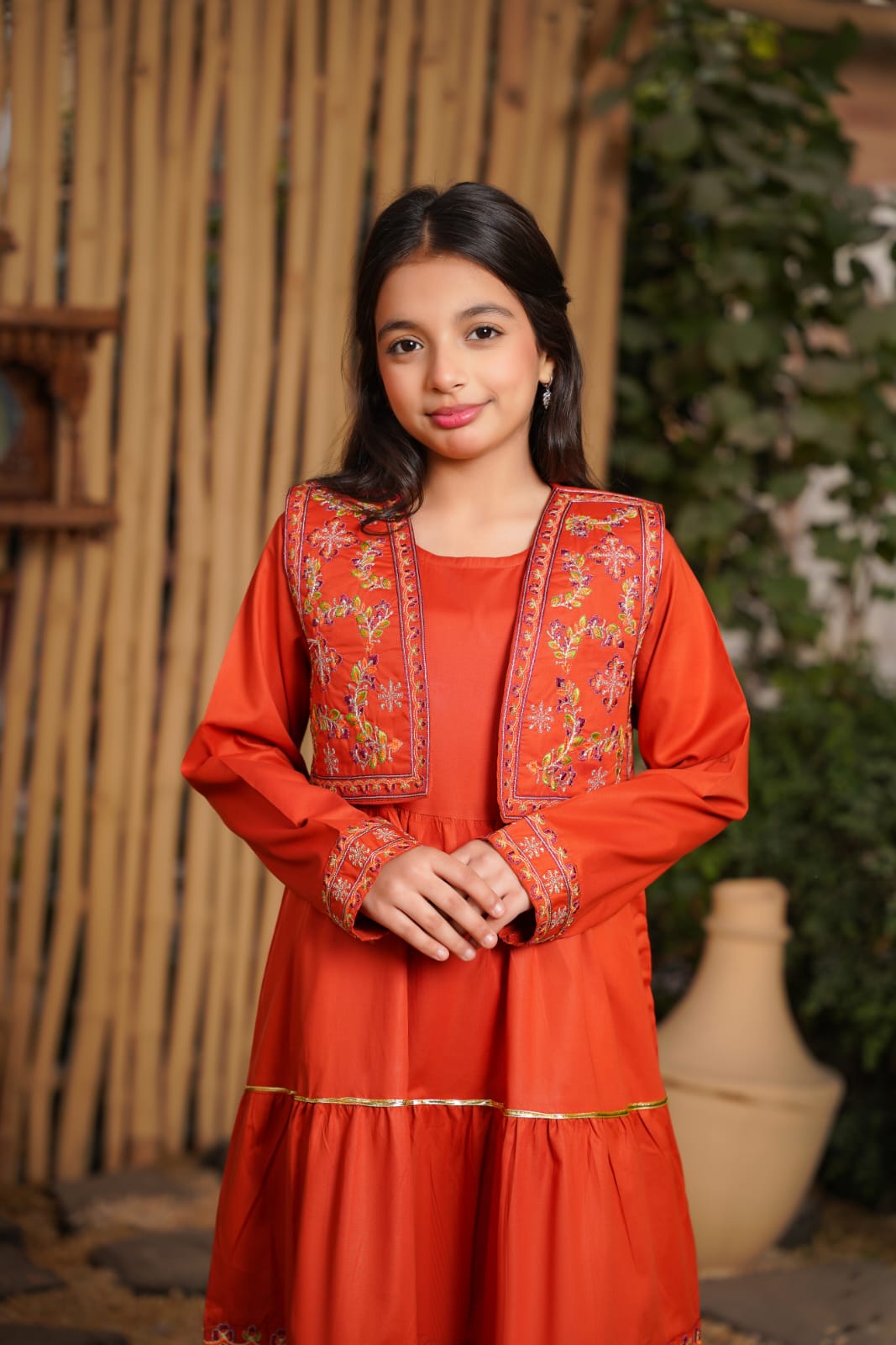Introducing the Amber Royal Maxi, an exquisite choice for your Eid celebrations. This stunning long maxi dress features intricate embroidered detailing on a coordinating koti, creating a sophisticated silhouette that commands attention. The rich amber tones and ornate embroidery work together to deliver a regal, festive aesthetic perfect for special occasions.