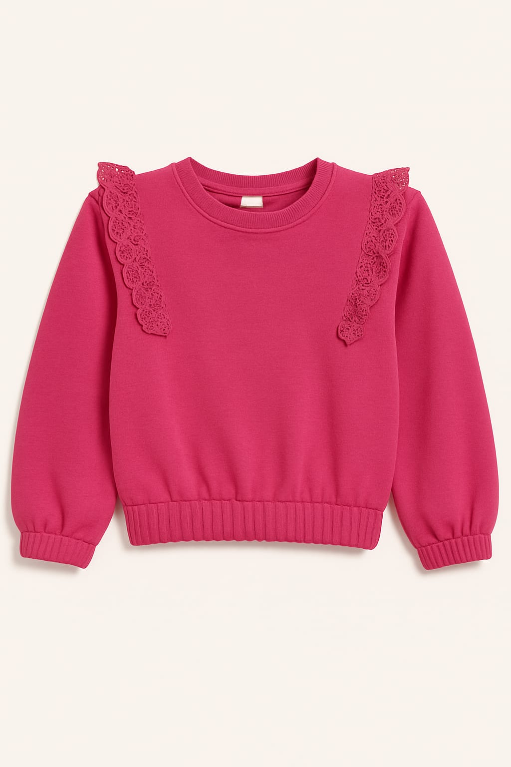 Elevate her winter wardrobe with this refined ruffle lace sweatshirt from Lily. Crafted with delicate lace detailing and charming ruffled accents, this piece seamlessly blends comfort with elegance. Perfect for layering or wearing solo, it's designed to keep her cozy while maintaining a polished, put-together look throughout the season. An essential addition for the discerning young fashionista.